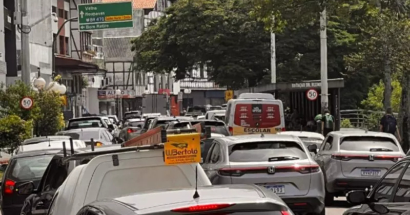 “Excesso de veículos em pouco tempo” travou o trânsito em Blumenau nesta terça, explica GMT